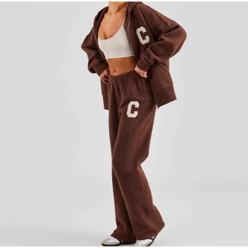 Ensemble Cardigan et pantalon en tricot pour femmes, décontracté, capuche, fermeture éclair, manches longues, manteau ample, pantalon droit, mode dame, costume 2 pièces, automne 2025