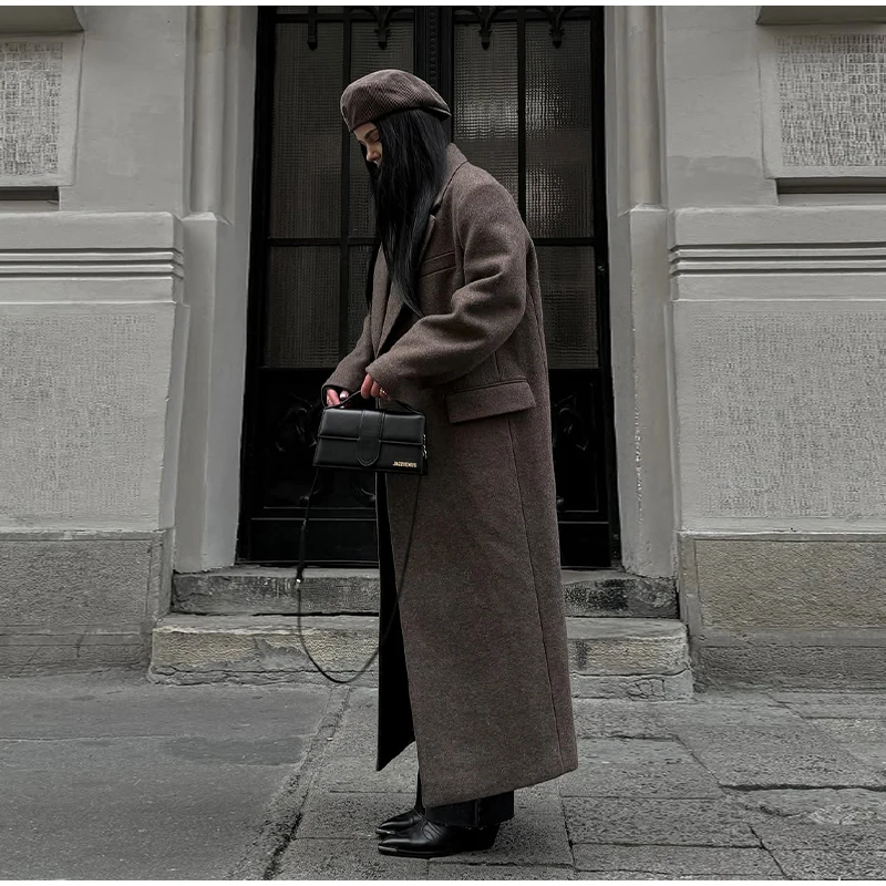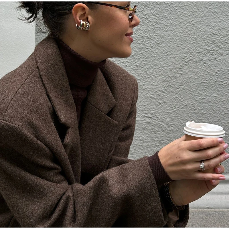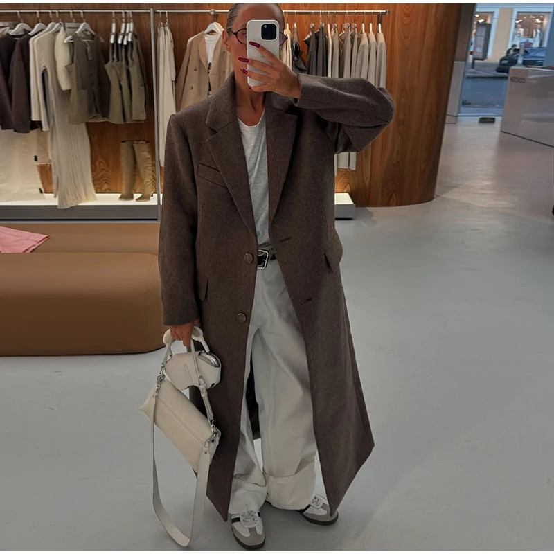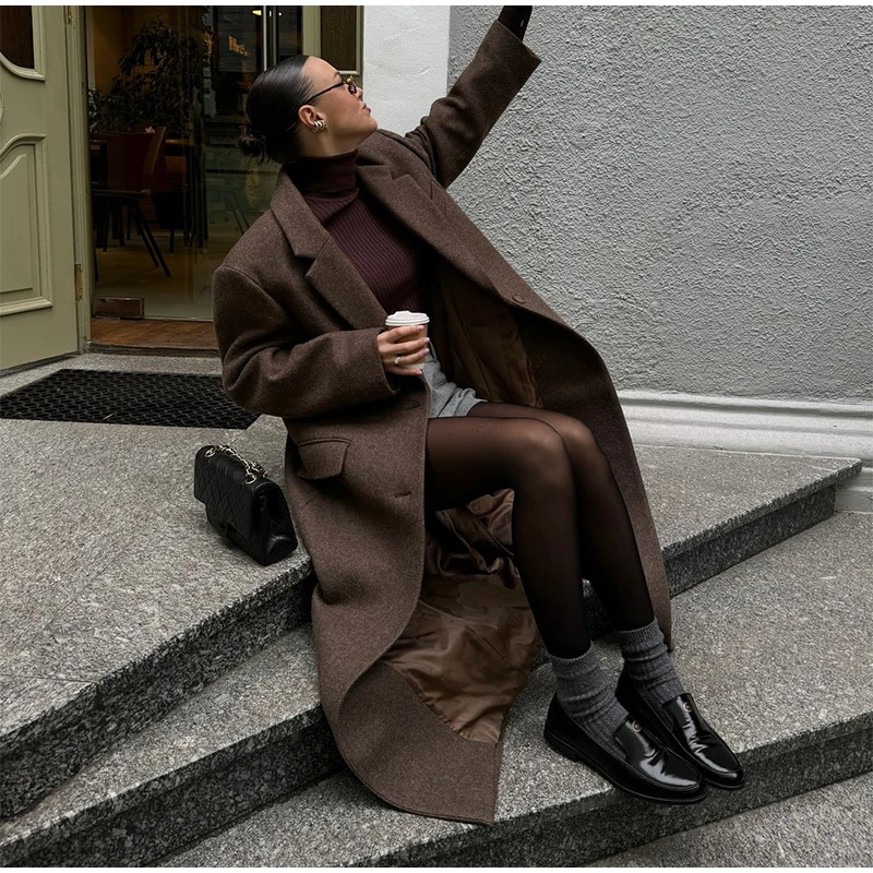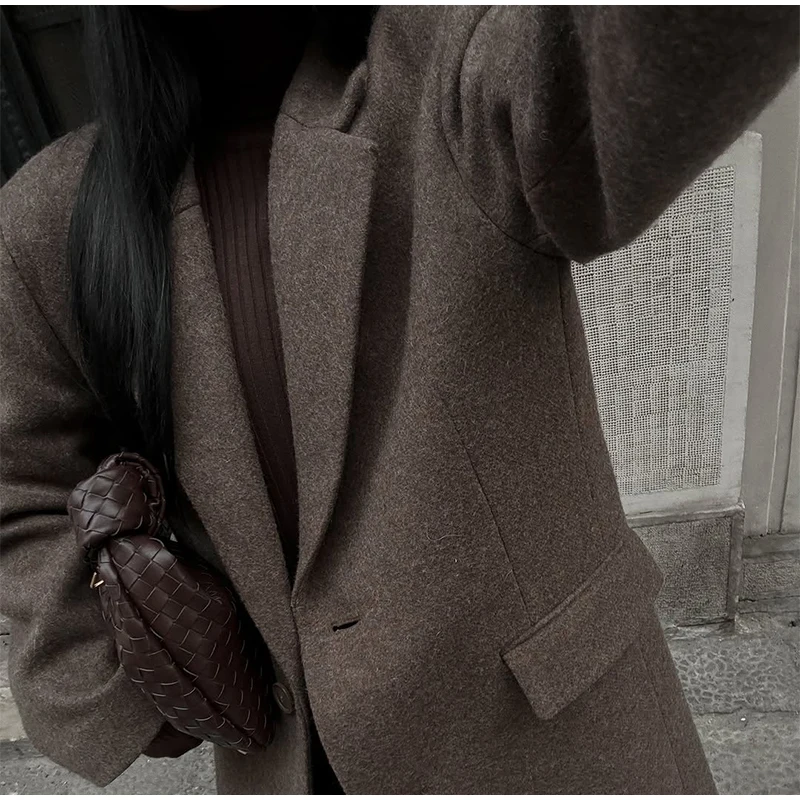 Marron épaulière laine mélange pardessus femmes élégant revers simple boutonnage à manches longues manteau 2025 automne dame banlieue vêtements d'extérieur