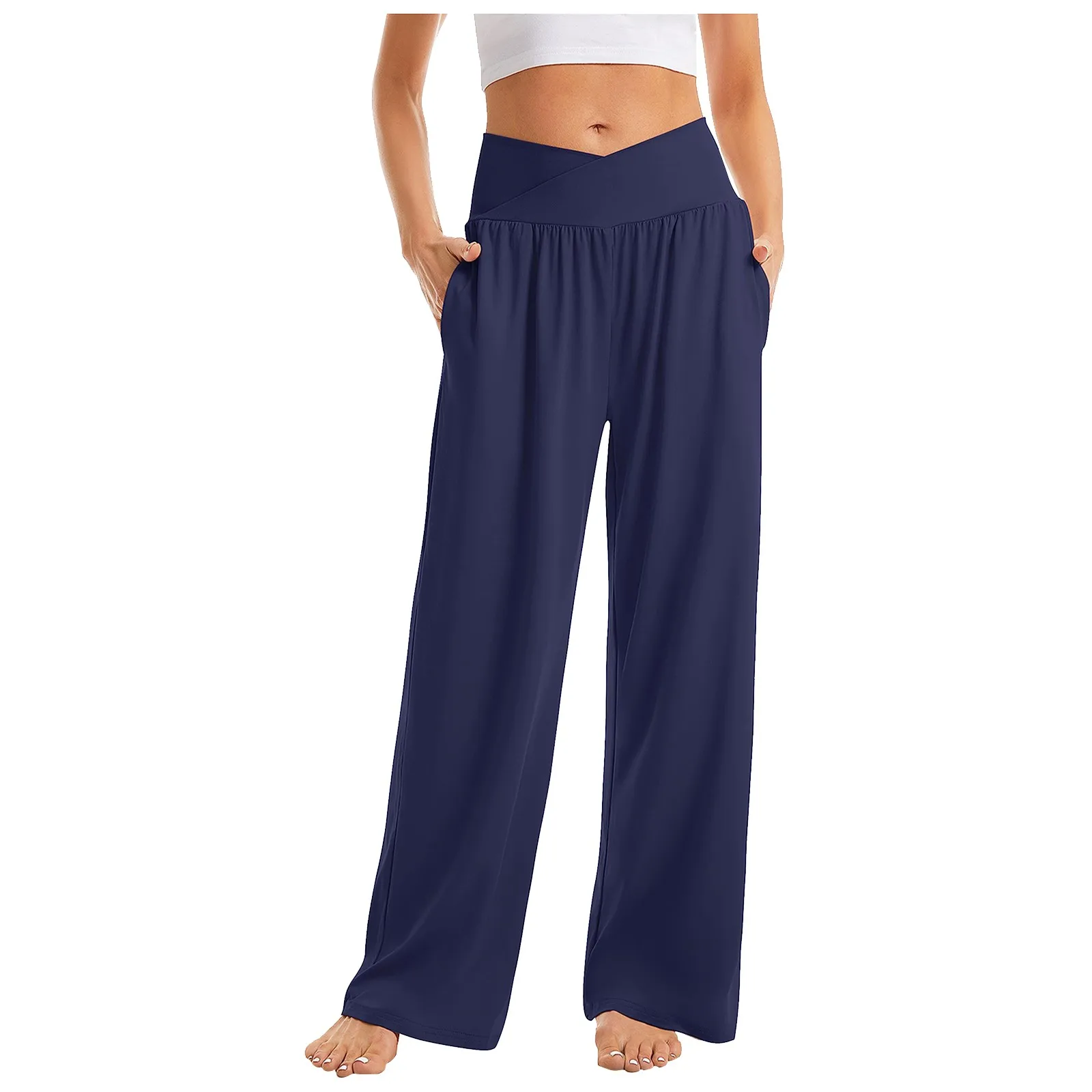 Pantalon décontracté de couleur unie taille haute pour femme Pantalon de sport à jambes larges avec poches