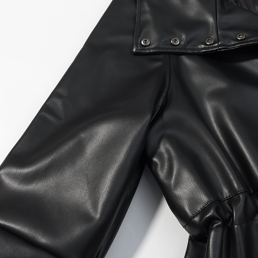 Temperament stand collar long sleeved single breasted black PU jacket with waist cinching for women